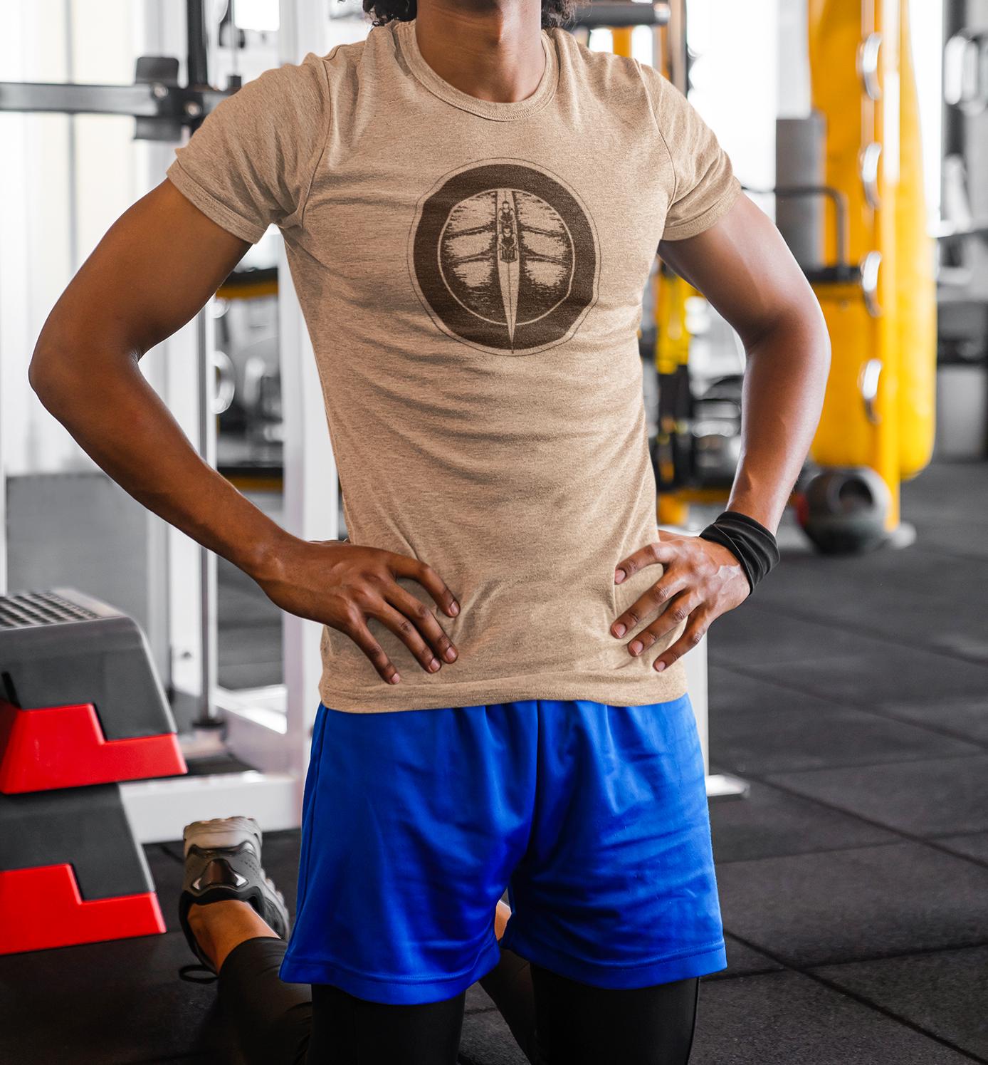 This mocha rowing t-shirt features a striking vintage boat print for crew enthusiasts and rowers who appreciate retro style. The centered circular graphic showcases a detailed overhead view of a rowing shell, perfect for coxswains and rowers who live the water lifestyle.